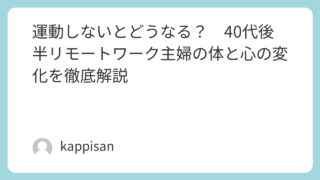 40代後半、リモートワーク中心の生活で外出はほぼゼロ。話し相手は子供たちがメイン。運動らしい運動は全くしていません。最近、体力の衰えと将来への不安を強く感じるようになりました。同じような状況の方に、私の体験と調べた情報をシェアします。 【4...